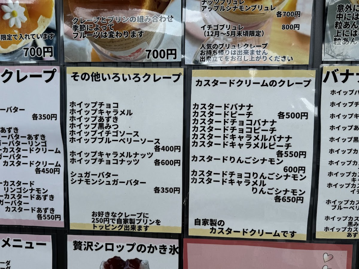 As you step into this cozy establishment, you're greeted by a warm atmosphere, punctuated by the inviting scent of freshly made crepes. The vibrant colors of the menu items reflect not just their visual appeal but also an unforgettable flavor experience waiting to unfold. The highlight of the menu includes a variety of exquisite crepes, featuring rich fillings like ホイップチョコバナナ (whipped chocolate banana) and ホイップカスタード (whipped custard), which locals rave about for their delightful consistency and taste.
